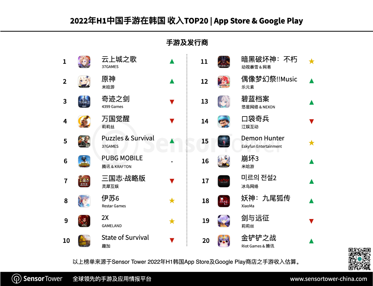 37GAMES《云上城之歌》在2022年上半年持续发力,以超6000万美元营收体现成为韩国商场最吸金的我国手游,《原神》、《奇观之剑》紧随其后。一起,此3款出海手游均成功闯入韩国热销榜前十。