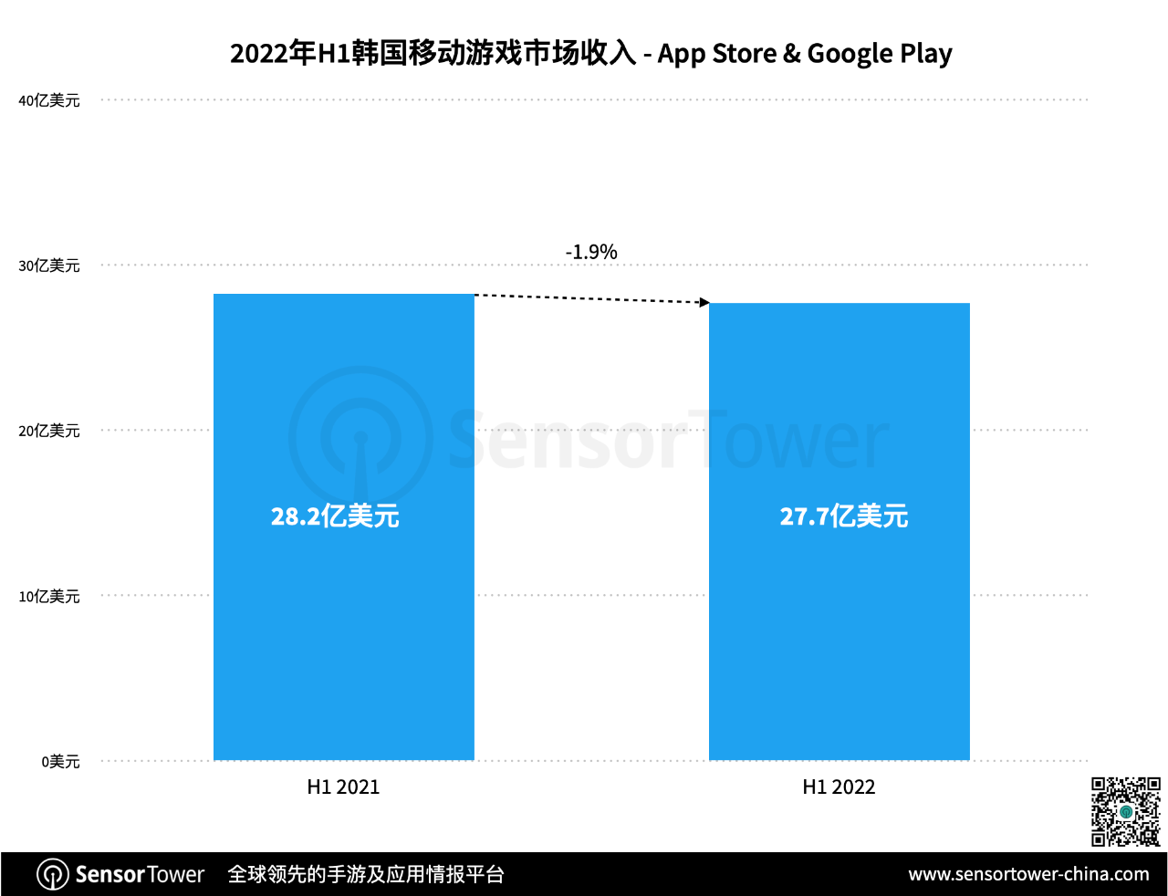 2022年上半年韩国移动游戏商场收入为27.7亿美元,同比小幅下降1.9%。安卓用户奉献近80%收入比例,较2021年同期下滑4.4%;iOS用户开销则迎来显着增加,同比进步9.1%。