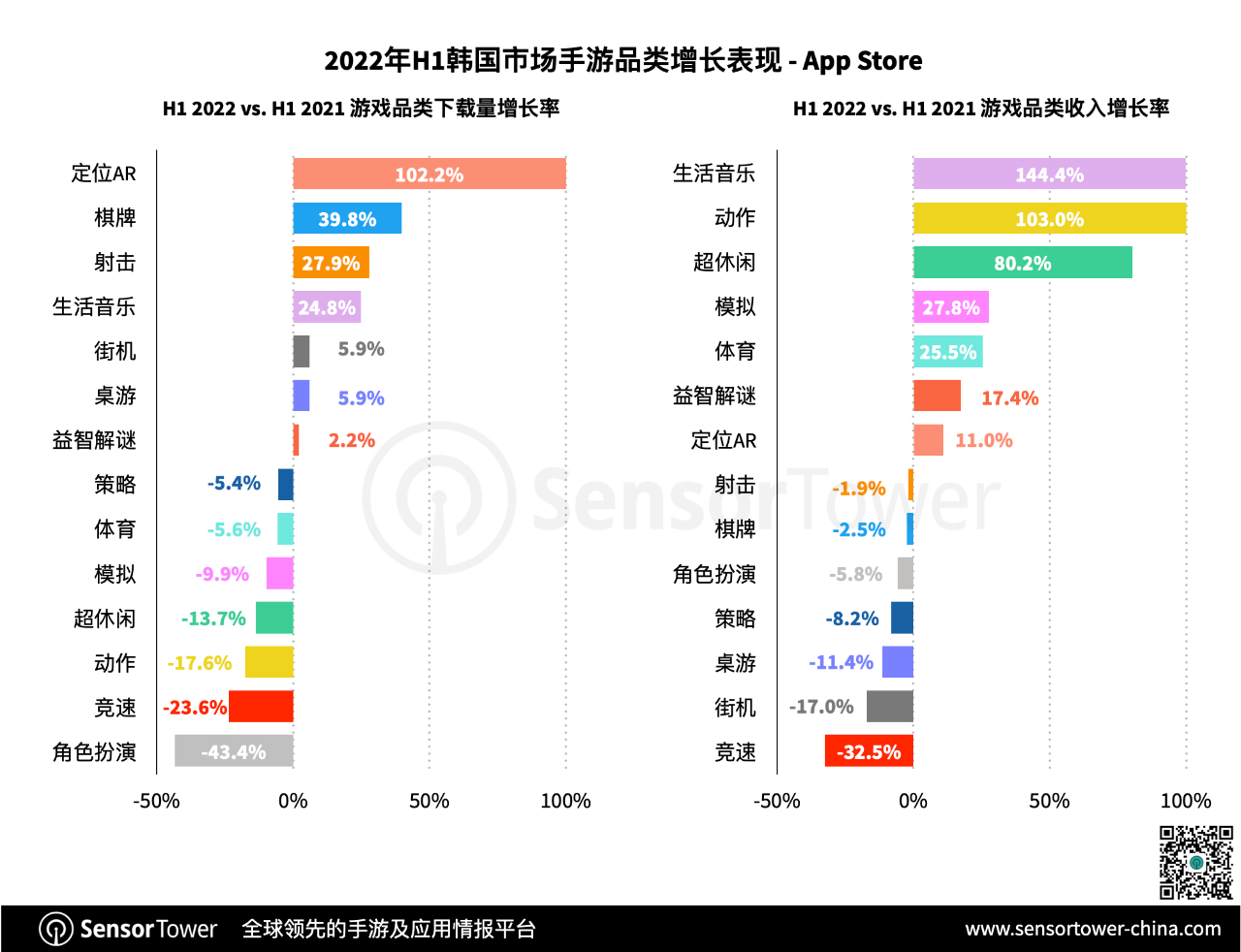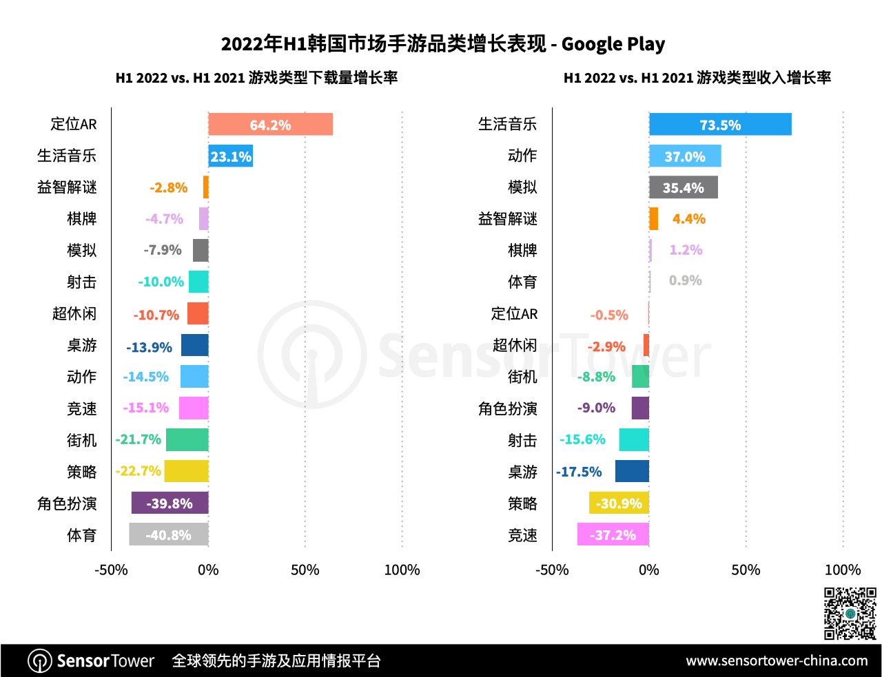 下载量方面,两款搜集虚拟运动鞋的计步休闲游戏《STEPN》、《Aglet》在2022年上半年开端盛行,使定位AR品类取得102.2%下载量增加。此外,棋牌、射击以及日子音乐游戏均体现出杰出增加势态。