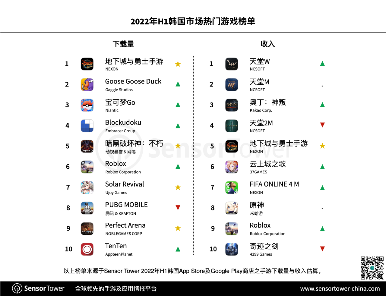 作为韩国商场最吸金的品类,RPG游戏在2022年H1热销榜Top 10中足足占有6席。其间,NCSOFT与Kakao Corp. 别离凭仗天堂系列手游与《奥丁:神叛》分割收入榜前3。其他收入排名上升的手游包含《云上城之歌》、《FIFA ONLINE 4 M》以及《Roblox》。