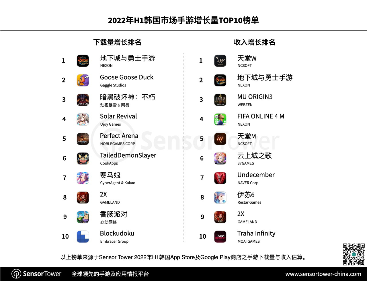 NCSOFT于2021年11月发行的又一天堂系列著作《天堂W》体现杰出,成为2022年上半年期间韩国商场收入增加最显着的手游。《天堂W》也是本期仅有一款收入增加超越1亿美元的游戏。收入增加排名前十中,仅《地下城与勇士手游》、《FIFA ONLINE 4 M》与《 Undecember》为非RPG手游,足见该品类在当地巨大的影响力。