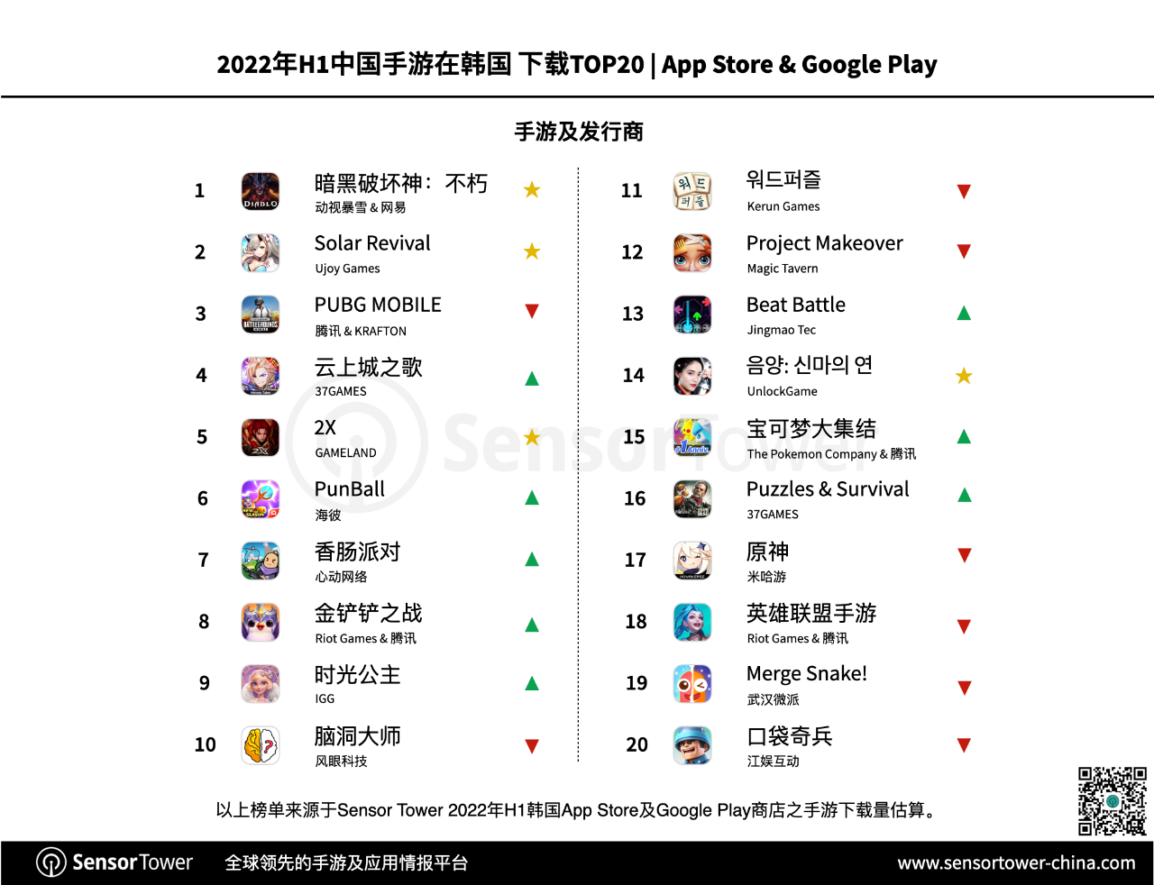本期共26款我国手游入围韩国下载榜Top 100。动视暴雪端游IP《暗黑破坏神:永存》手游版别推出之后便敏捷登顶韩国Google Play手游下载榜首位。到2022年6月,《暗黑破坏神:永存》在韩国已取得超100万下载量。另一款Ujoy Games发行的RPG新游《Solar Revival》凭仗超卓的本地化营销成功来到出海下载榜第二名。