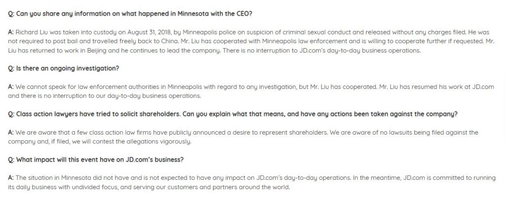 答:刘理查于 2018 年 8 月 31 日因涉嫌性犯罪被明尼阿波利斯警方逮捕,未经申述被开释。他不需要保释,能够自由地回来我国。刘先生已与明尼苏达州法律部分协作,并乐意进一步协作,假如要求的话。刘先生已回来北京作业,他持续领导该公司。京东的日常事务运作没有中止。