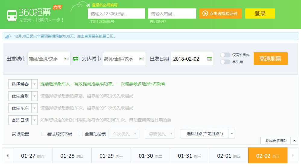 因而,关于抢手动身地的返乡客来说,提早规划抢票日程显得尤为重要。2018年伊始,360浏览器就上线了抢票日历,便当用户依据本身需求设定抢票日期。假如动身地热度极高,用户还可自定义动身日期、车次、席座等,360浏览器会协助用户主动监测余票状况,一旦发现余票,将立刻奉告用户赶快购买。
