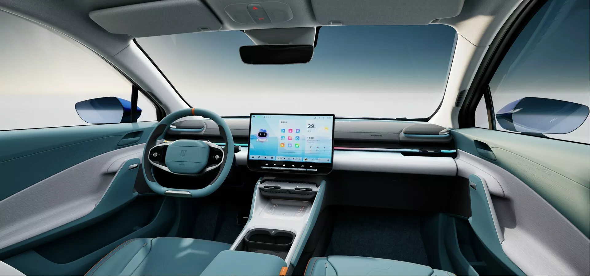内饰适当精约,但装备精良。车内有大型全景玻璃车顶、可装备的环境照明、亮堂的橙色装修以及 15.6 英寸的大型信息文娱显示屏。Skywell 还为后座乘客增加了一个八扬声器 Metz 音响系统和一个小型触摸屏。