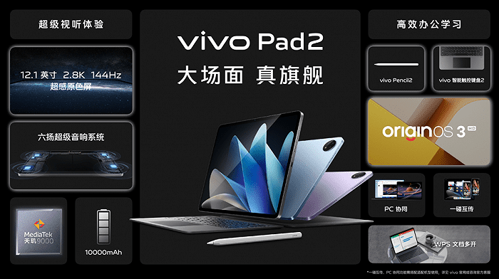 此外,vivo还发布了新一代的旗舰平板vivo Pad2,搭载定制的12.1英寸、2.8K、144Hz超感原色屏,天玑9000旗舰芯片,自研六扬超级音响体系,10000mAh超大电池,以及全新的vivo Pencil2和vivo智能触控键盘2等全线旗舰装备,全面释放出“大屏真旗舰”的产品功用。